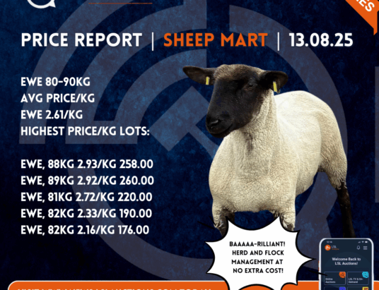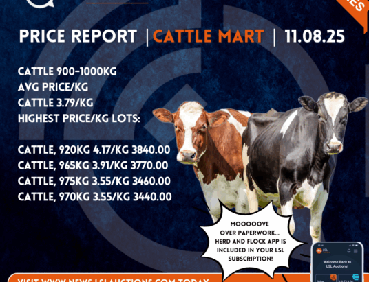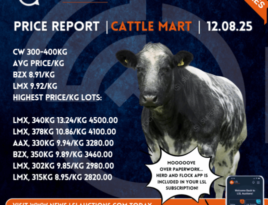 Wednesday selected Cattle Mart Price Report: Copyright LSL Auctions F COW 400-500kg Avg Price/KgFR 2.92/kg Highest Price/Kg Lots:FR, 480kg 3.29/kg 1580.00FR, 407kg 2.97/kg 1210.00FR, 490kg 2.78/kg 1360.00FR, 482kg 2.63/kg 1270.00 F COW 600-700kg Avg Price/KgFR 2.38/kgFRX 2.29/kg Highest Price/Kg Lots:AAX, 685kg 3.72/kg 2550.00FR, 670kg 3.66/kg 2450.00HEX, 655kg 3.19/kg 2090.00FR, 600kg 3.13/kg 1880.00NRX, 665kg 3.04/kg 2020.00FR, 655kg 2.92/kg 1910.00 F COW 800-900kg Avg Price/KgFR 3.43/kg Highest Price/Kg Lots:FR, 815kg 3.55/kg 2890.00FR, 805kg…