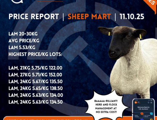 Monday selected Sheep Mart Price Report: Copyright LSL Auctions SHEEP 20-30kgAvg Price/KgSHEEP 1.77/kg Highest Price/Kg Lots:SHEEP, 24kg 6.94/kg 170.00SHEEP, 20kg 6.25/kg 125.00SHEEP, 24kg 6.17/kg 148.00SHEEP, 20kg 6.05/kg 124.00SHEEP, 20kg 6.01/kg 122.00SHEEP, 20kg 5.91/kg 120.00 To see more samples of Sheep Market Prices, visit: https://www.lslauctions.com/Don’t miss out on the latest news and updates from LSL Auctions! Sign up now to get exclusive access to our Facebook page.🐑 Herd and Flock management app at NO extra fees?!…