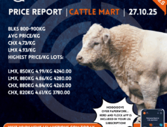 Agriculture/Livestock Auction online Cattlle News LSL Select Price Report – Cattle Mart – 23/10/2025 Thursday selected Cattle Mart Price Report: Copyright LSL Auctions RU 300-400kg Avg Price/KgAAX 4.32/kgCHX 4.53/kgLMX 5.60/kg Highest Price/Kg Lots:LMX, 310kg 6/kg… access_time6 months ago FacebookTwitterGoogle+LinkedInPinterestshare Agriculture/Livestock Auction online News Sheep LSL Select Price Report – Sheep Mart – 23/10/2025 Thursday selected Sheep Mart Price Report: Copyright LSL Auctions L2 20-30kg Avg Price/Kg3.41/kg Highest Price/Kg Lots:24kg 4.17/kg 100.0028kg 3.96/kg 111.0030kg 3.44/kg… access_time6 months ago FacebookTwitterGoogle+LinkedInPinterestshare Agriculture/Livestock Auction online News Sheep LSL Select Price Report – Sheep Mart – 22/10/2025 Wednesday selected Sheep Mart Price Report: Copyright LSL Auctions LAMB 20-30kg Avg Price/KgLAMB 2.82/kg Highest Price/Kg Lots:LAMB, 25kg 6.37/kg 160.00LAMB, 26kg… access_time6 months ago FacebookTwitterGoogle+LinkedInPinterestshare Agriculture/Livestock Auction online Cattlle News LSL Select Price Report – Cattle Mart – 22/10/2025 Wednesday selected Cattle Mart Price Report: Copyright LSL Auctions F COW 400-500kg Avg Price/KgFR 2.82/kgFRX 2.37/kgFRX,JEX 2.22/kgJEX 2.12/kgJEX,FRX 2.06/kg Highest Price/Kg… access_time6 months ago FacebookTwitterGoogle+LinkedInPinterestshare Agriculture/Livestock Auction online News Sheep LSL Select Price Report – Sheep Mart – 20/10/2025 Monday selected Sheep Mart Price Report: Copyright LSL Auctions RAM LAMB SP 20-30kgAvg Price/KgRAM LAMB SP 7.74/kg Highest Price/Kg Lots:RAM LAMB… access_time6 months ago FacebookTwitterGoogle+LinkedInPinterestshare Agriculture/Livestock Auction online Cattlle News LSL Select Price Report – Cattle Mart – 20/10/2025 Monday selected Cattle Mart Price Report: Copyright LSL Auctions CATTLE 500-600kgAvg Price/KgAA 2.88/kgBB 1.75/kgCATTLE 3.65/kgCH 3.41/kgDAQ 3.57/kgFR 2.69/kgHER 0.43/kgHOL 0.22/kgLIM 3.06/kgSBR… access_time6 months ago FacebookTwitterGoogle+LinkedInPinterestshare Agriculture/Livestock Auction online News Sheep LSL Select Price Report – Sheep Mart – 18/10/2025 Saturday selected Sheep Mart Price Report: Copyright LSL Auctions LAM 20-30kgAvg Price/KgLAM 5.48/kg Highest Price/Kg Lots:LAM, 21kg 6.67/kg 140.00LAM, 24kg 6.04/kg… access_time6 months ago FacebookTwitterGoogle+LinkedInPinterestshare Agriculture/Livestock Auction online Cattlle News LSL Select Price Report – Cattle Mart – 18/10/2025 Saturday selected Cattle Mart Price Report: Copyright LSL Auctions WHF 300-400kgAvg Price/KgAAX 4.40/kgLMX 5.20/kg Highest Price/Kg Lots:LMX, 315kg 5.52/kg 1740.00CHX, 310kg… access_time6 months ago FacebookTwitterGoogle+LinkedInPinterestshare Agriculture/Livestock Auction online News Sheep LSL Select Price Report – Sheep Mart – 17/10/2025 Friday selected Sheep Mart Price Report: Copyright LSL Auctions LAMB 50-60kgAvg Price/KgLAMB 2.33/kg Highest Price/Kg Lots:LAMB, 50kg 3.4/kg 170.00LAMB, 53kg 1.25/kg… access_time6 months ago FacebookTwitterGoogle+LinkedInPinterestshare Agriculture/Livestock Auction online Cattlle News LSL Select Price Report – Cattle Mart – 17/10/2025 Friday selected Cattle Mart Price Report: Copyright LSL Auctions BK 700-800kAvg Price/KgLMX 4.26/kg Highest Price/Kg Lots:LMX, 775kg 4.77/kg 3700.00HEX, 720kg 4.12/kg… access_time6 months ago FacebookTwitterGoogle+LinkedInPinterestshare Agriculture/Livestock Auction online News Sheep LSL Select Price Report – Sheep Mart – 16/10/2025 Thursday selected Sheep Mart Price Report: Copyright LSL Auctions L2 40-50kgAvg Price/Kg3.09/kg Highest Price/Kg Lots:, 46kg 4.63/kg 214.00, 41kg 3.55/kg 146.00,… access_time6 months ago FacebookTwitterGoogle+LinkedInPinterestshare Agriculture/Livestock Auction online Cattlle News LSL Select Price Report – Cattle Mart – 16/10/2025 Thursday selected Cattle Mart Price Report: Copyright LSL Auctions CA 300-400kgAvg Price/KgAAX 4.13/kg.CHX 5.16/kgLMX 5.11/kgLMX,LMX 5.34/kg Highest Price/Kg Lots:CHX, 300kg 6.2/kg… access_time6 months ago FacebookTwitterGoogle+LinkedInPinterestshare Agriculture/Livestock Auction online News Sheep LSL Select Price Report – Sheep Mart – 15/10/2025 Wednesday selected Sheep Mart Price Report: Copyright LSL Auctions EWE 60-70kgAvg Price/KgEWE 1.51/kg Highest Price/Kg Lots:EWE, 67kg 3.01/kg 202.00EWE, 63kg 0/kg… access_time7 months ago FacebookTwitterGoogle+LinkedInPinterestshare Agriculture/Livestock Auction online Cattlle News LSL Select Price Report – Cattle Mart – 15/10/2025 Wednesday selected Cattle Mart Price Report: Copyright LSL Auctions WEAN MALE 300-400kg Avg Price/KgLMX 4.79/kg Highest Price/Kg Lots:LMX, 300kg 5.23/kg 1570.00LMX, 310kg… access_time7 months ago FacebookTwitterGoogle+LinkedInPinterestshare Agriculture/Livestock Auction online News Sheep LSL Select Price Report – Sheep Mart – 14/10/2025 Tuesday selected Sheep Mart Price Report: Copyright LSL Auctions LAMBS 50-60kgAvg Price/KgLAMBS 2.48/kg Highest Price/Kg Lots:LAMBS, 50kg 2.96/kg 148.00LAMBS, 50kg 2.8/kg… access_time7 months ago FacebookTwitterGoogle+LinkedInPinterestshare Agriculture/Livestock Auction online Cattlle News LSL Select Price Report – Cattle Mart – 14/10/2025 Tuesday selected Cattle Mart Price Report: Copyright LSL Auctions CA 300-400kgAvg Price/KgAAX 4.81/kgBBX 4.14/kgHEX 4.60/kg Highest Price/Kg Lots:HEX, 315kg 5.08/kg 1600.00AAX,… access_time7 months ago FacebookTwitterGoogle+LinkedInPinterestshare Agriculture/Livestock Auction online News Sheep LSL Select Price Report – Sheep Mart – 13/10/2025 Monday selected Sheep Mart Price Report: Copyright LSL Auctions SHEEP 20-30kgAvg Price/KgSHEEP 1.77/kg Highest Price/Kg Lots:SHEEP, 24kg 6.94/kg 170.00SHEEP, 20kg 6.25/kg… access_time7 months ago FacebookTwitterGoogle+LinkedInPinterestshare Agriculture/Livestock Auction online Cattlle News LSL Select Price Report – Cattle Mart – 13/10/2025 Monday selected Cattle Mart Pri