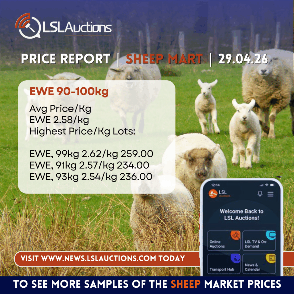 News Cattle Mart – Price Roundup 12-04-2021 Monday’s selected cattle mart price report: copyright LSL. BULLOCK 300-400kg Mon 12 Apr Avg Price/KgAAX 2.27/kgFR 1.49/kgHEX 2.22/kgLMX 1.59/kgM BULLOCK… access_time5 years ago FacebookTwitterGoogle+LinkedInPinterestshare News Sheep Mart – Price Roundup 12-04-2021 Monday’s selected sheep mart price report: copyright LSL. SHEEP 30-40kg Mon 12 Apr Avg Price/KgSHEEP 3.79/kgHighest Price/Kg Lots:SHEEP, 40kg 4.32/kg… access_time5 years ago FacebookTwitterGoogle+LinkedInPinterestshare News Survey to look at cow temperament Cattle farmers are being invited to take part in a survey for a research project called ‘TemperGene’. The project is… access_time5 years ago FacebookTwitterGoogle+LinkedInPinterestshare News Antibiotic Colistin to be banned for animal health treatment The antibiotic Colistin will be discontinued for animal health use, announced the Minister for Agriculture, Food and the Marine Charlie… access_time5 years ago FacebookTwitterGoogle+LinkedInPinterestshare News Great stock at Abbeyfeale Mart GVM Group this weekend. Check out Lot 181, 151 & 69 (pictured) Watch this video clip on www.lslauctions.com/tv Some great stock at Abbeyfeale Mart GVM Group this weekend. Lots to check out… access_time5 years ago FacebookTwitterGoogle+LinkedInPinterestshare News Big interest in Lot 900 at Aurivo Livestock Mart Mohill. Must see outfit sold for 2320 Watch this video clip on www.lslauctions.com/tv Big interest in this outfit at Aurivo Livestock Mart Mohill this Saturday. Take a… access_time5 years ago FacebookTwitterGoogle+LinkedInPinterestshare News Must see lot from Ballinasloe Cooperative Livestock Mart. Lot 309 sold for 2850 Watch this video clip on www.lslauctions.com/tv Must see lot from Ballinasloe Cooperative Livestock Mart over the weekend. Homebred stock, in-calf… access_time5 years ago FacebookTwitterGoogle+LinkedInPinterestshare News Top price this weekend at Midland & Western, Lot 24 sold for €4800 Top price this weekend at Midland & Western Livestock Improvement Society Limited, Pedigree Bull & Heifer Sale was the outstanding… access_time5 years ago FacebookTwitterGoogle+LinkedInPinterestshare News Stand-out bullock at Roscommon Mart this week – Lot 37B sold for 2040 Watch this video clip on www.lslauctions.com/tv Stand-out bullock at Roscommon Mart this week. Take a look at Lot 37B, sold… access_time5 years ago FacebookTwitterGoogle+LinkedInPinterestshare News Great big strong simmental bull at Carnew Mart – Lot 102 sold for 2080 Watch this video clip on www.lslauctions.com/tv Great big strong simmental bull at Carnew Mart had big interest. Big fleshy bull… access_time5 years ago FacebookTwitterGoogle+LinkedInPinterestshare News Must see Charolais purebred registered bull at Gortatlea Mart – Lot 912 sold for 2350 Watch this video clip on www.lslauctions.com/tv Must see Charolais purebred registered bull at Gortatlea Mart. Great big bull in Lot… access_time5 years ago FacebookTwitterGoogle+LinkedInPinterestshare News Outstanding Aberdeen Angus bull sells at Kilmallock Mart GVM Group. Champion bull in Lot 41 DARAREA SIMON sold for 2700 Watch this video clip on www.lslauctions.com/tv Outstanding Aberdeen Angus bull sells at Kilmallock Mart GVM Group. Champion bull in Lot… access_time5 years ago FacebookTwitterGoogle+LinkedInPinterestshare News Incredible dairy sale at Corrin Cork Co-Op Marts – Lot 49 sold for 4000 Watch this video clip on www.lslauctions.com/tv Incredible dairy sale at Corrin Cork Co-Op Marts yesterday. Lot 49 sold for 4000.… access_time5 years ago FacebookTwitterGoogle+LinkedInPinterestshare News Sheep sales hit 400 at Ballybofey & Stranorlar Co-operative Livestock Mart. Lot 64 & Lot 65A Watch this video clip on www.lslauctions.com/tv Sheep sales hit 400 at Ballybofey & Stranorlar Co-operative Livestock Mart Licence…Mighty stock at… access_time5 years ago FacebookTwitterGoogle+LinkedInPinterestshare News Stand-out lot at Newport Livestock Mart this week. Cow & heifer calf in Lot 354, sold for 2020 Watch this video clip on www.lslauctions.com/tv Stand-out lot at Newport Livestock Mart this week. Take a look at this cow… access_time5 years ago FacebookTwitterGoogle+LinkedInPinterestshare News Outfit at Gort Co Op Mart – Lot 803 sold for 1880 at 442KG Watch this video clip on www.lslauctions.com/tv Lots of on-demand plays of this video clip at Gort Co Operative Mart Ltd… access_time5 years ago FacebookTwitterGoogle+LinkedInPinterestshare News Super outfit in Aurivo Livestock Mart Ballymote. Lot 2605 sold for 1960 Watch this video clip on www.lslauctions.com/tv Super outfit in Aurivo Livestock Mart Ballymote sold this Thursday. Bull calf with second… access_time5 years ago FacebookTwitterGoogle+LinkedInPinterestshare News Best cow at Ennis Clare Co-Operative Marts this week – Lot 17B sold for 2100 Watch this video clip on www.lslauctions.com/tv Some great cows at Ennis Clare Co-Operative Marts this week, but she was the… access_time5 years ago FacebookTwitterGoogle+LinkedInPinterestshare News Ireland Weather Forecast: Saturday 10 April and Sunday 11 April Transitioning to a less cold southwesterly regime through Sunday with rain or showers early next week, especially in the west… access_time5 years ago FacebookTwitterGoogle+LinkedInPinterestshare News Minister launches UN Food Systems Summit dialogues Minister for Agriculture, Food and the Marine Charlie McConalogue has announced a series of four national dialogues on Ireland’s food… access_time5 years ago FacebookTwitterGoogle+LinkedInPinterestshare News Strong demand for lambs and hoggets continues Demand for hoggets, lambs and cull ewes is stronger again this week, according to the IFA. It is believed that… access_time5 years ago FacebookTwitterGoogle+LinkedInPinterestshare News Re-Opening of UK food service sector will drive demand for beef The phased re-opening of the food sector in the UK will incre
